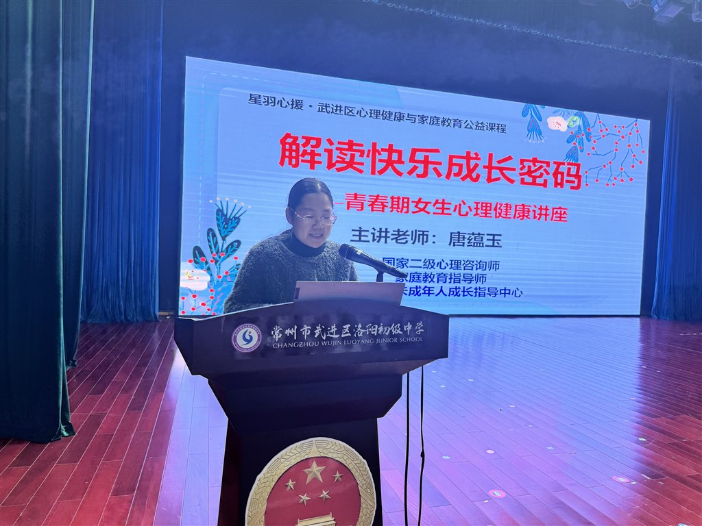 为助力青春期女生拨开迷雾,从容应对成长中的挑战,引导她们科学认知身心变化,树立积极健康的成长观,3月17日下午三点,洛阳初级中学特邀国家二级心理咨询师、武进区家庭教育及心理健康教育讲师团名师唐蕴玉校长,为七、八年级全体女生带来了一场主题为“解读快乐成长密码”的青春期心理健康讲座,以温暖而专业的力量,为青春护航。讲座由学生发展处吴春兰副主任主持。